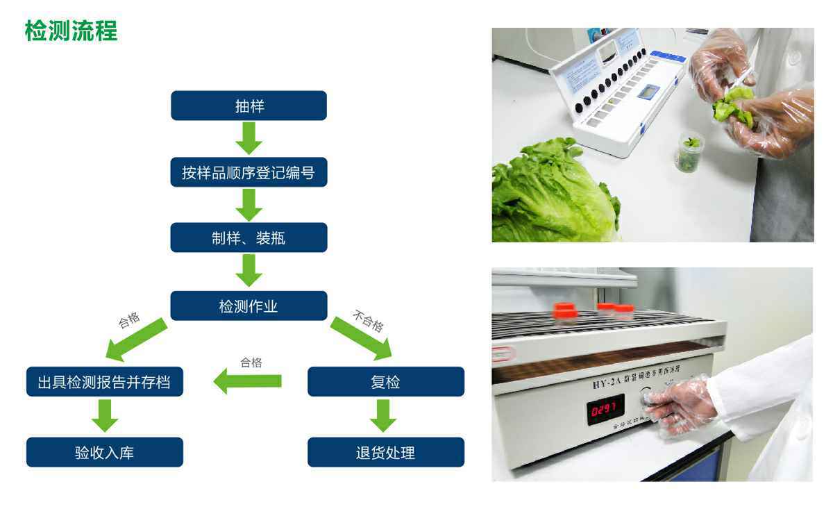 公司配备专业食品检验工,持有中高级职 业资格证书。对进出配送中心的食材(肉品、 蔬菜、粮油等)实行每批次检测,保障食材的 安全。